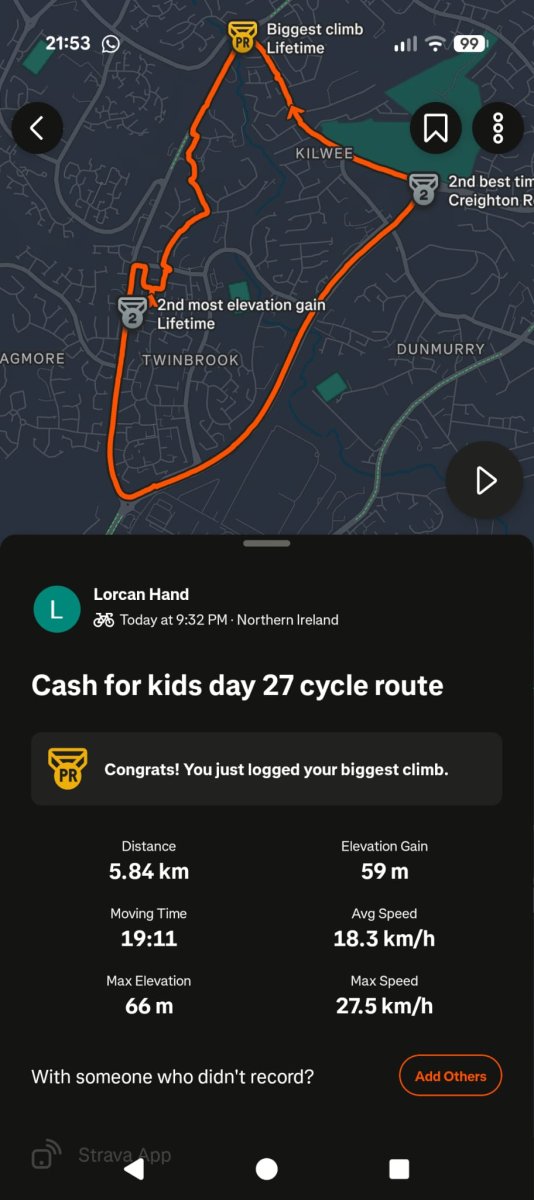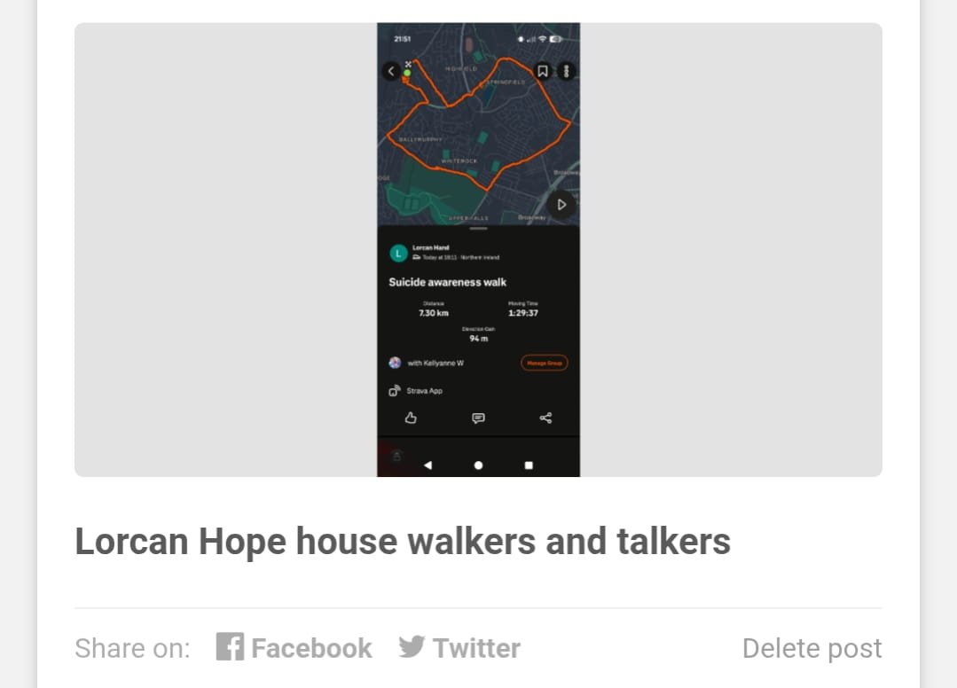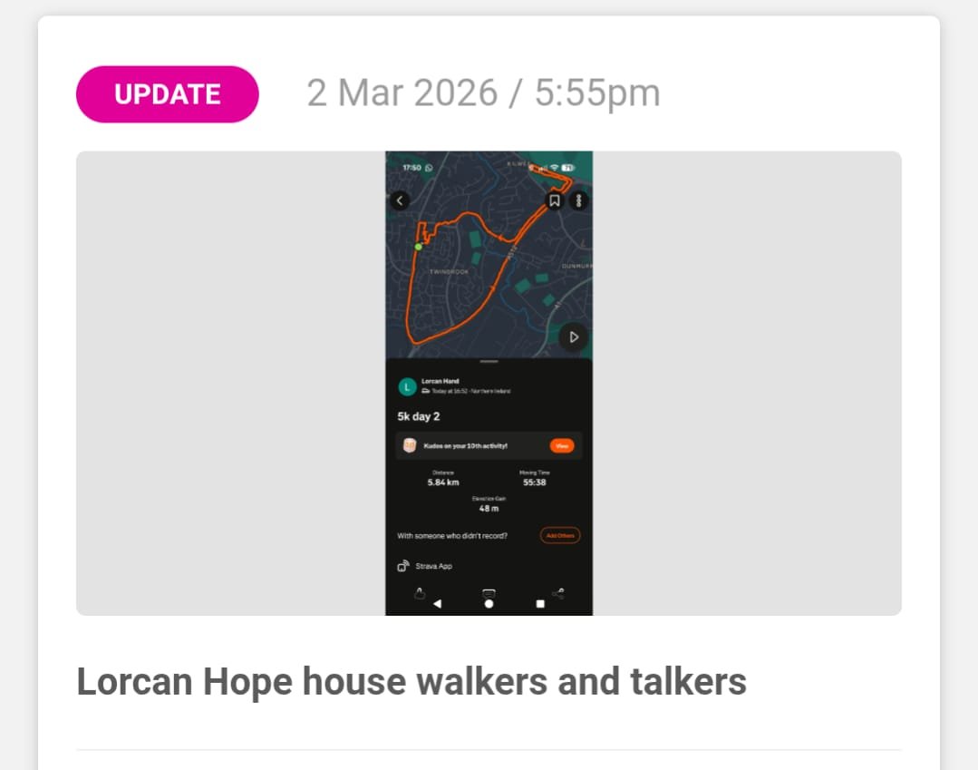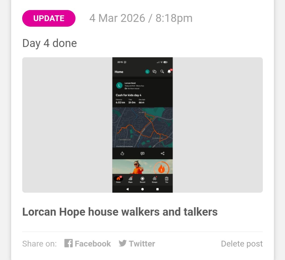 Well done to all hope house walkers and talkers on there 5k a day for the last 28 days and all the people who sponsored everyone and money raised for cash for kids and I want to give a special shout our to my wife gemma who 28 days ago would not walk anywhere and went and smashed it well done proud of you