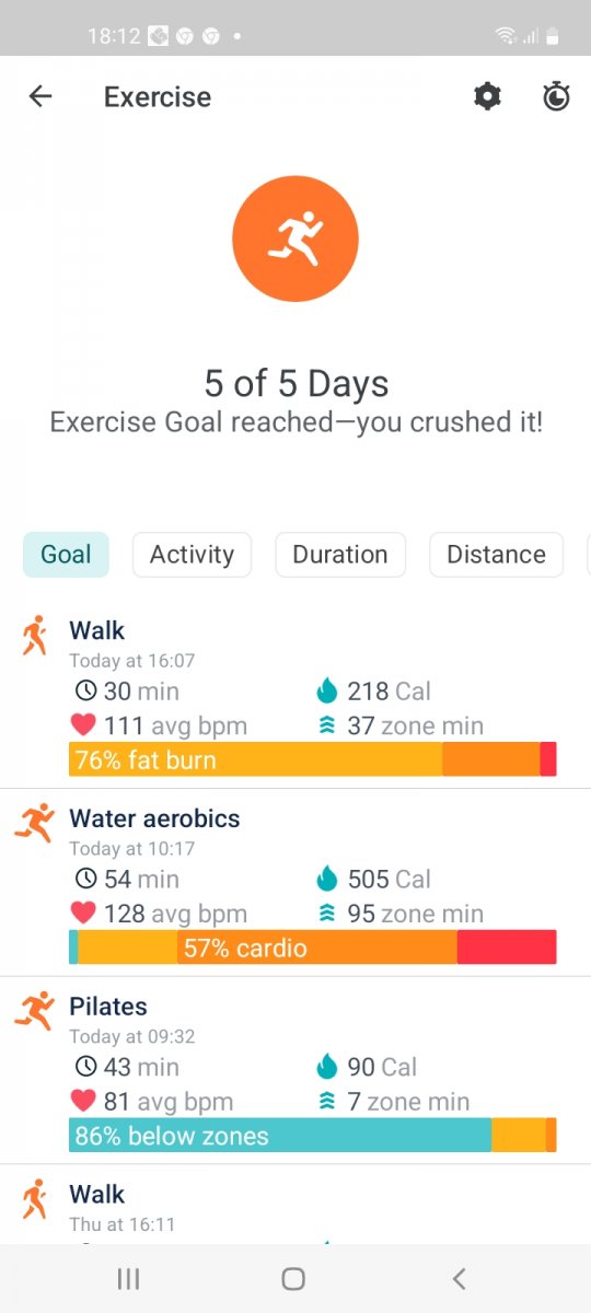 Wouldn't you know, halfway through my walk this morning, my fitbit ran out of battery. Should be twice what is recorded. Afternoon workout was aquasize. Good start.