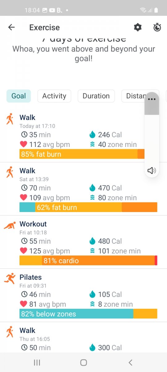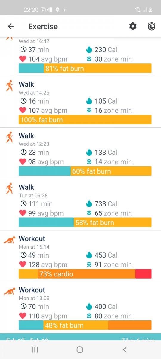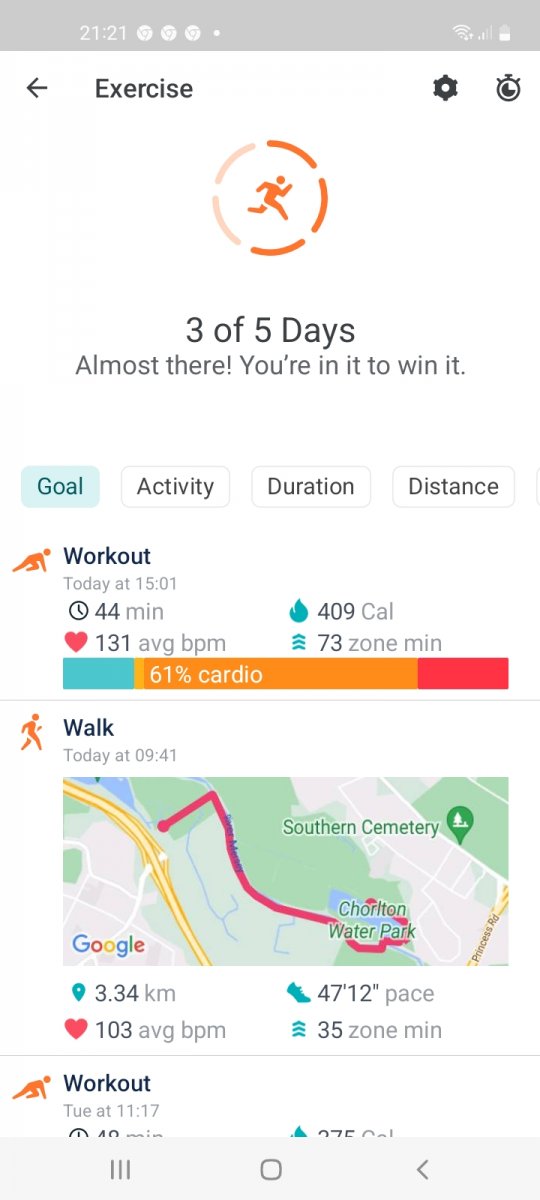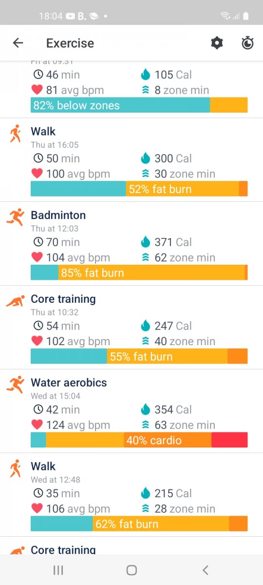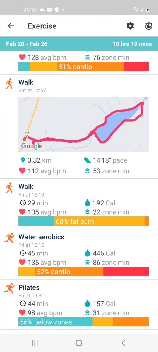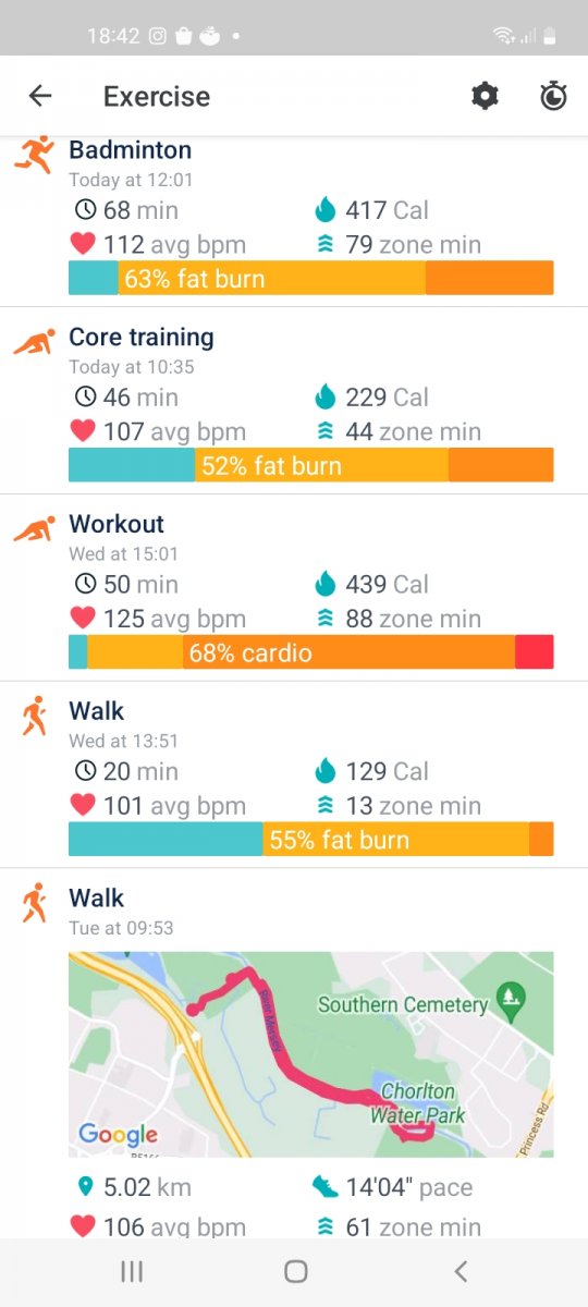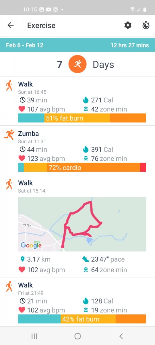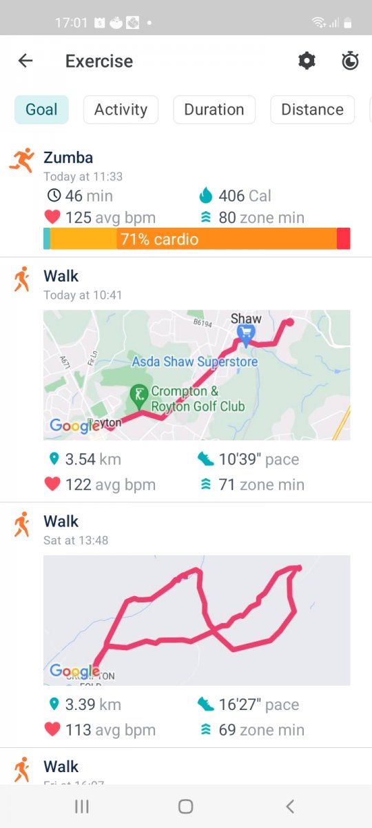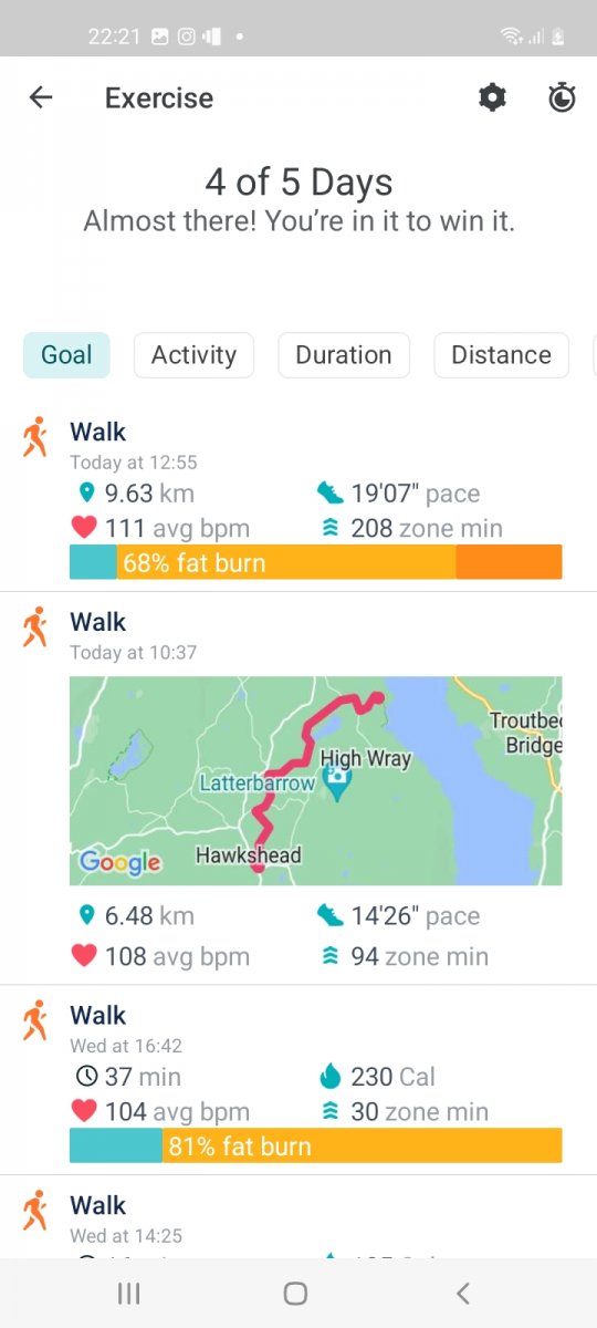 2996 mins of exercise registered, (when my Fitbit was charged🤣), over 1 hour 45 mins average per day, a mixture of classes run by Oldham Active and walks, both with and without Si, Daisy and Anthony.