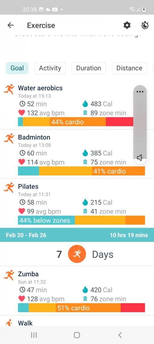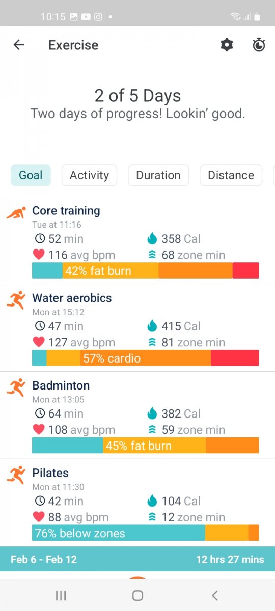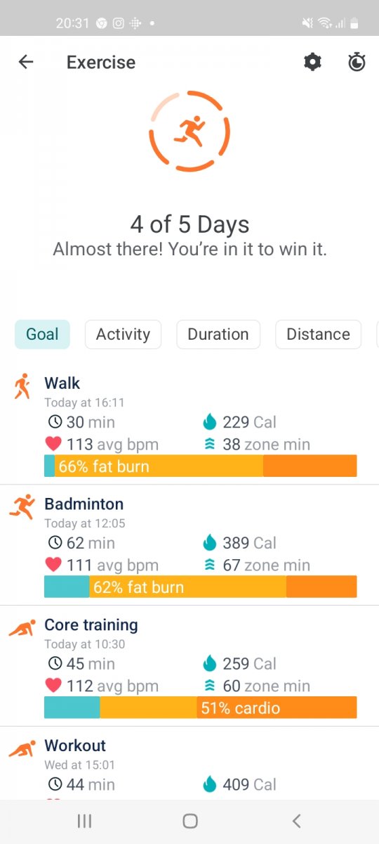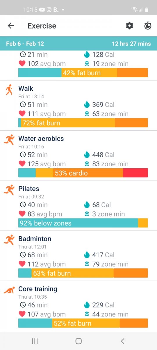 Pilates, badminton, rest walks
